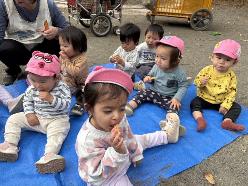 もも組は、朝おやつを食べずに出発し、公園でおやつを食べました。外で食べるおやつは気持ちいいね