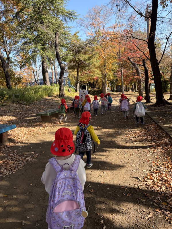 武蔵野公園は紅葉がとっても綺麗でした🍁子ども達のリュックには、レジャーシートと水筒が入っています。背中が少し重くてもとっても上手に歩きました。