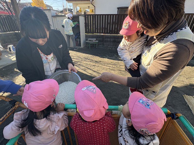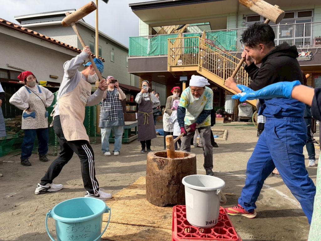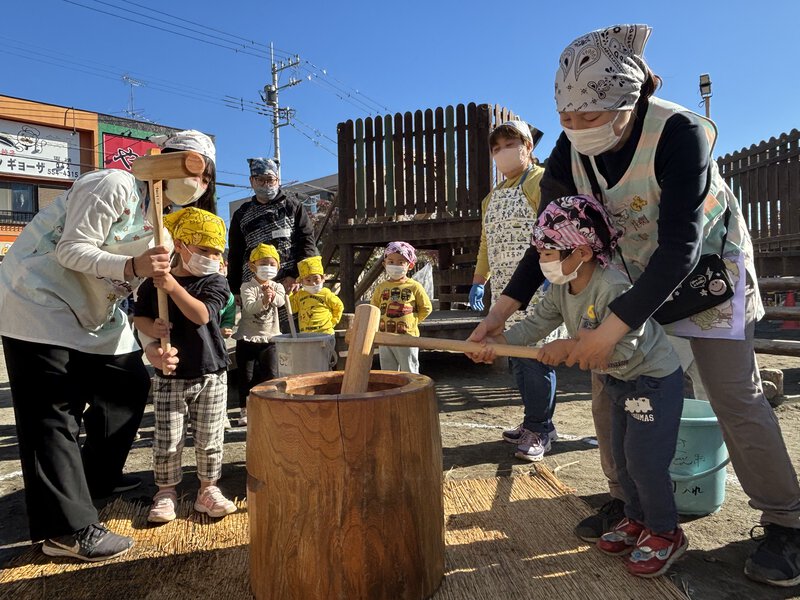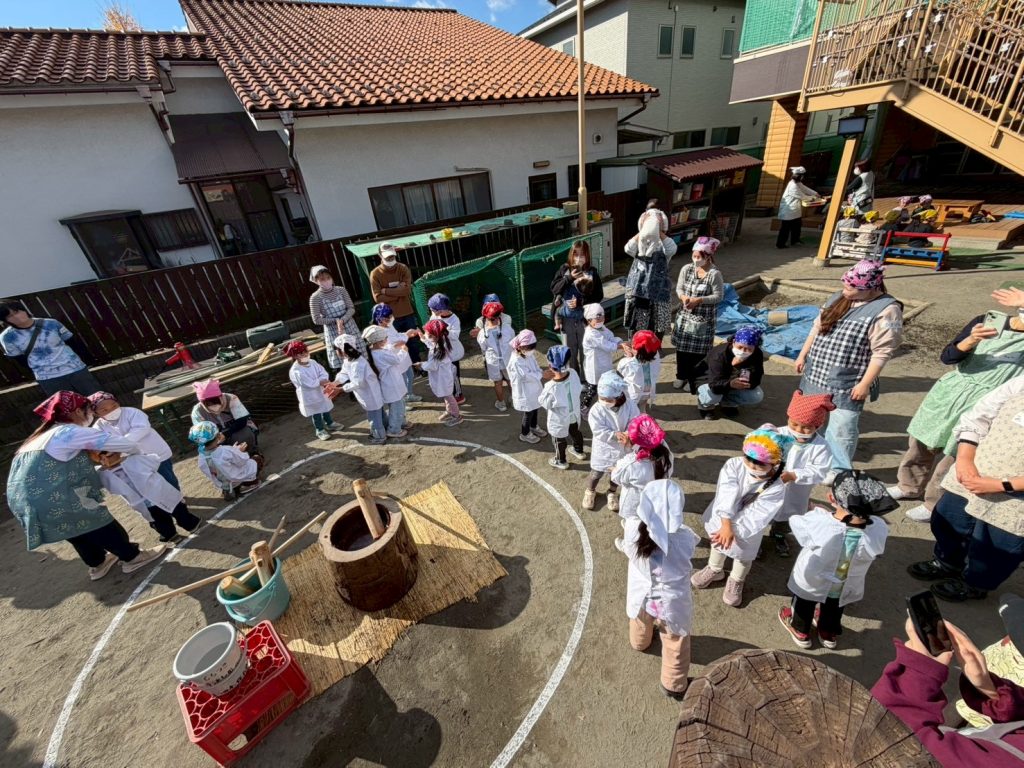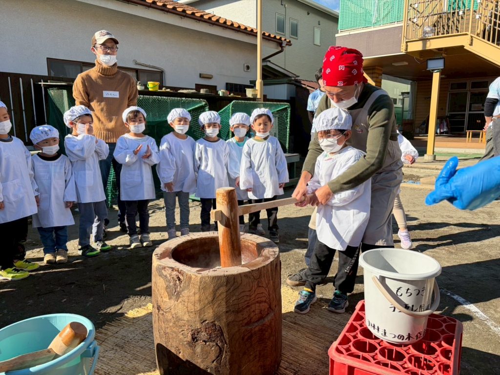 みんなで「よいしょ〜!」と掛け声をします。臼の中のおもちが気になる子どもたち。👀