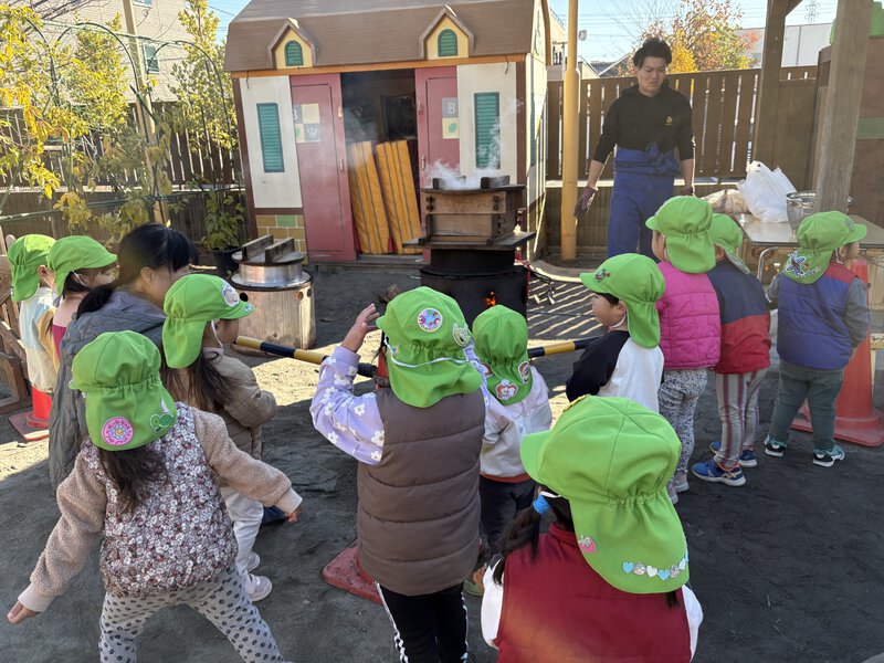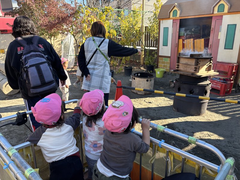 おもちつきをしました。まずは、火を起こしてもち米を蒸籠で蒸すところから。これはなんだろう?ともも組さんも興味津々。