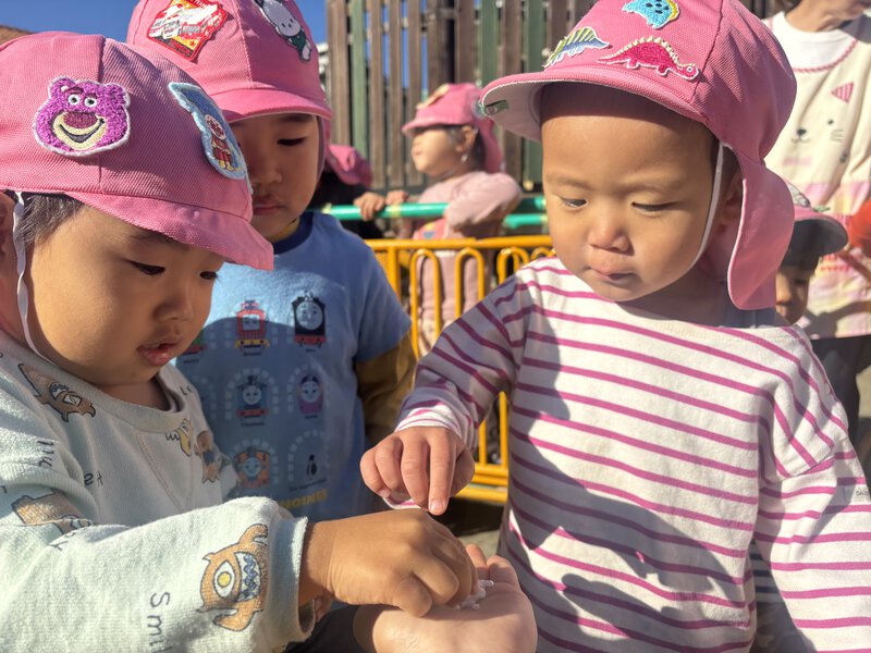 さくらんぼ組はお散歩前に腹ごしらえ。今日のおにぎりはもち米入り!きな粉を付けていただきまーす!いつもとなんだか違う?美味しくて何回もおかわりをしました✨️