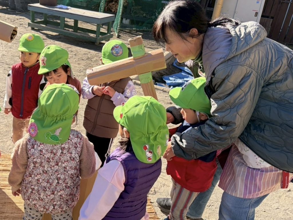 りんご組は、手作りの臼と杵でおもちつきをしました。「よいしょ〜!」という子どもたちの声がよく聞こえてきました。