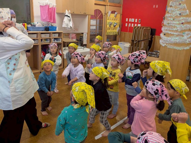 最後はぶどう組!ぶどう組はおもちつきの手遊びを披露しました。息ぴったりで上手におもちをつくことができそうです。