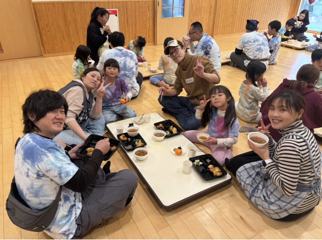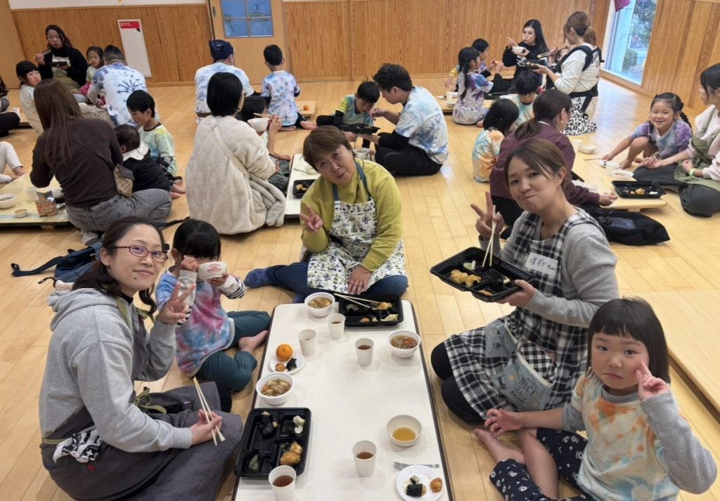 全部終わったらパパママぶどう組みんなホールに集まって、つきたてのおもちとかまどで作ったけんちん汁を食べよう!きな粉餅ものりしょうゆのお餅も美味しいね〜!