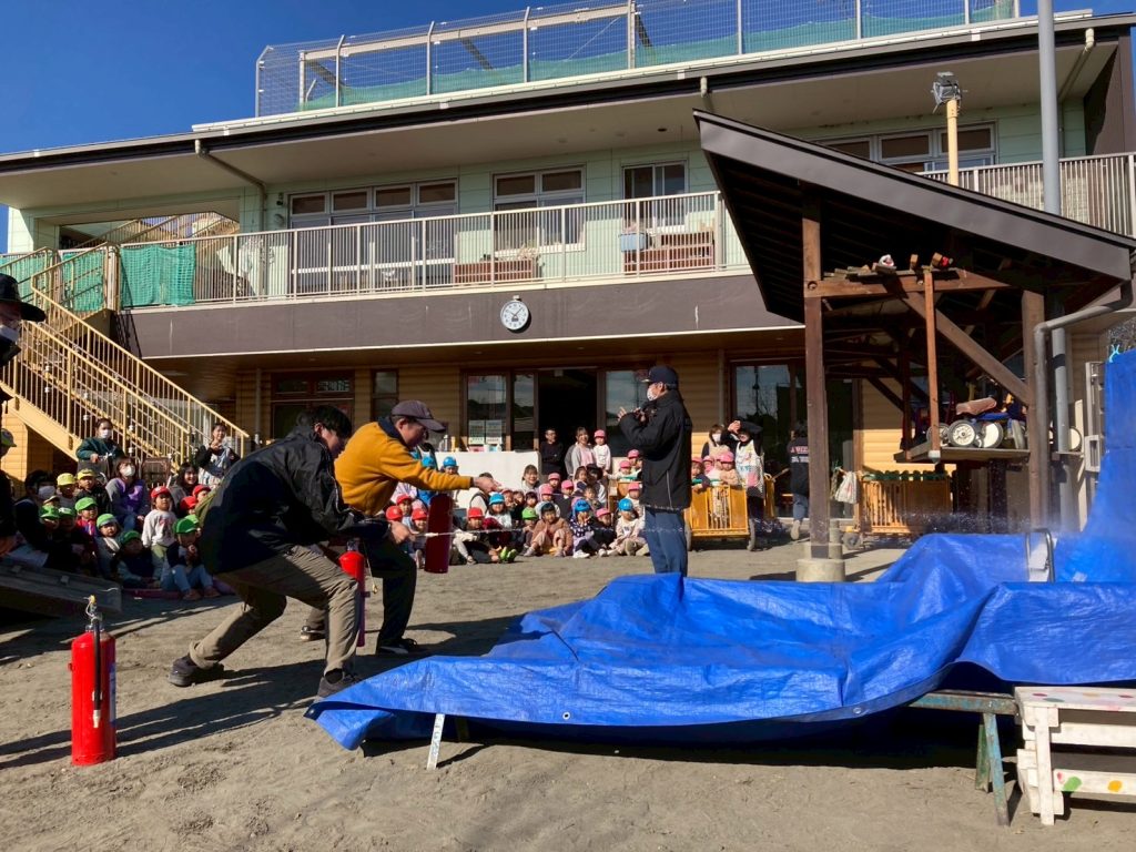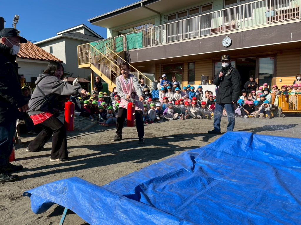 消防士さんが保育園に来てくれて、まずは消火訓練。